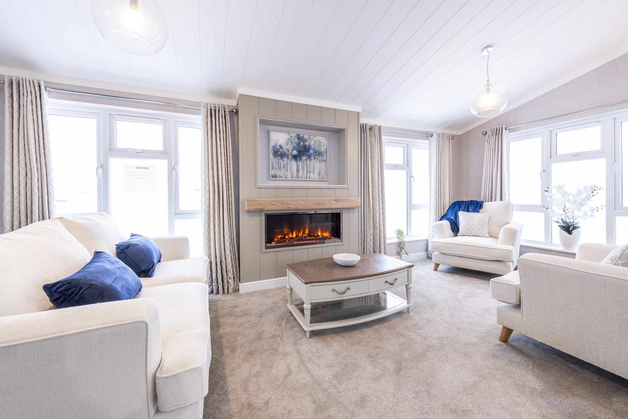 Inside, calming tones, luxurious fabrics and modern finishes create a cosy yet contemporary feel. The open-plan layout includes a spacious kitchen and dining area with sleek Strata worktops, integrated appliances, and stylish furnishings. Glazed internal doors connect the living spaces beautifully, while the feature fireplace and soft furnishings in the lounge add a warm, inviting touch. Every detail, from the panelled ceilings to the generous entrance hall with boot seat, has been designed for comfort and practicality. With one master bedroom and a second double bedroom, this build makes for a fantastically well-sized home.